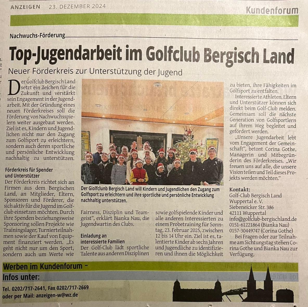 Top-Jugendarbeit im Golfclub Bergisch Land Laura 26. December 2024 Die Westdeutsche Zeitung hat einen wunderbaren Artikel über die Jugendarbeit in unserem Golfclub veröffentlicht.